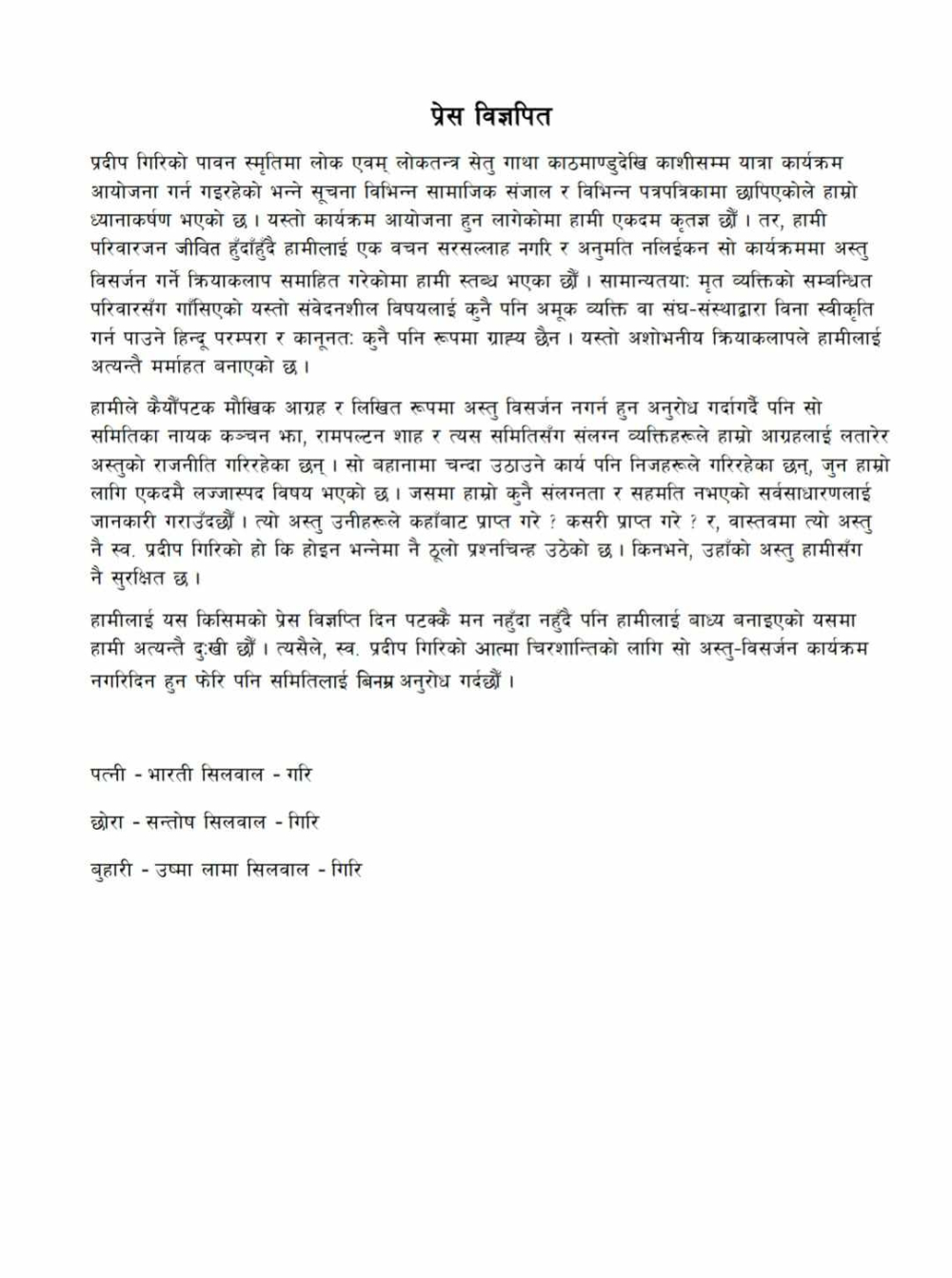 गिरिकी पत्नी भारती सिलवाल, छोरा सन्तोष र बुहारी उष्मा लामा सिलवालले विज्ञप्ति जारी गर्दै आफूहरुको अनुमति विना अस्तु विसर्जन कार्यक्रम राखेको गुनासो गरेका छन् ।